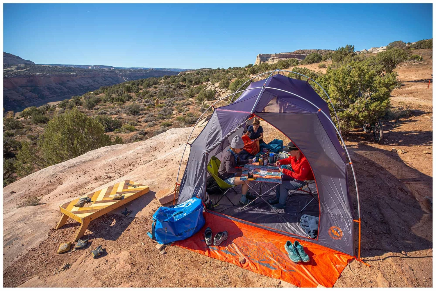 Shelter Mode set up option creates a large, open shelter that is an ideal shady spot for everyone to hang out under during hot days. Setup requires included fly, poles and webbing harness.