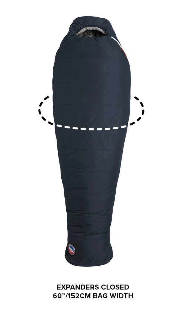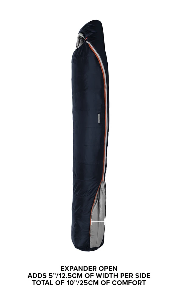 Expanded comfort with two zippered panels, running from shoulder to footbox, adding five extra inches of room to each side – 10″ total when completely expanded