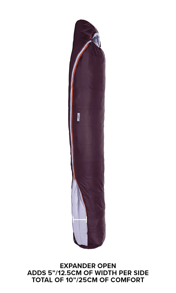 Expanded comfort with two zippered panels, running from shoulder to footbox, adding five extra inches of room to each side – 10″ total when completely expanded